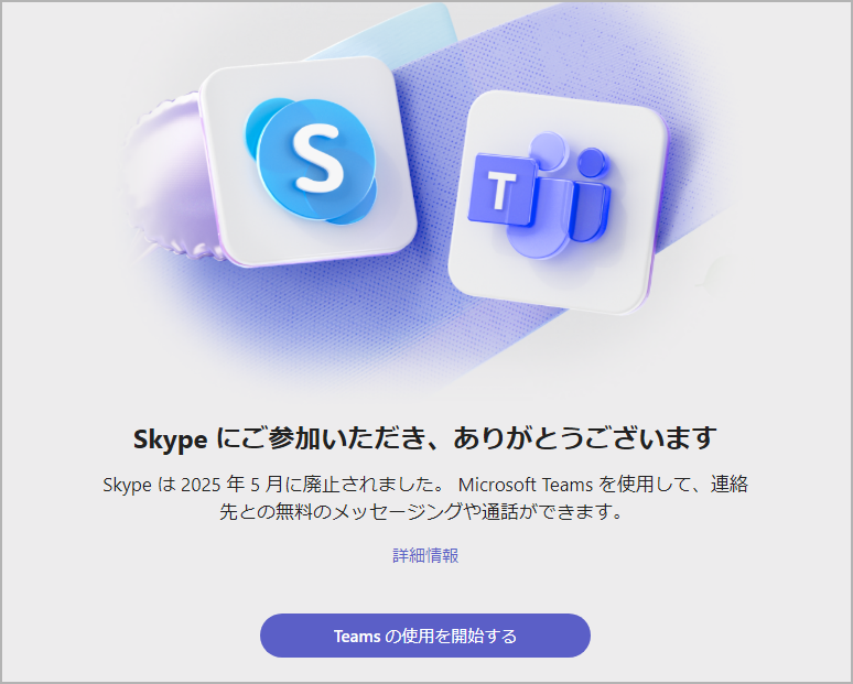 マイクロソフトは、無料および有料の個人向けテキスト音声ビデオチャットツールSkypeのサービスを2025年5月5日に終了しました。現在、Skypeアプリを起動すると[Teamsの使用を開始する]ボ…